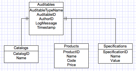 Now, the above design looks good from OO perspective. However, since we need to persist the data into a relational database, we will end up with one table per class and foreign keys to interlink. If you are doing Ruby on Rails, you will possibly use polymorphic association between Auditable and the subclasses. For an example, lets consider the following E-R design (not showing all relations):